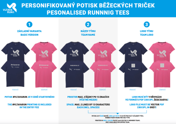 Zvolte potisk na záda startovních triček PUMA. Můžete si nechat dotisknout název nebo logo svého týmu. Pokud si personifikovaný potisk neobjednáte, budete se pyšnit hashtagem #vltavarun, který máte v ceně startovného.